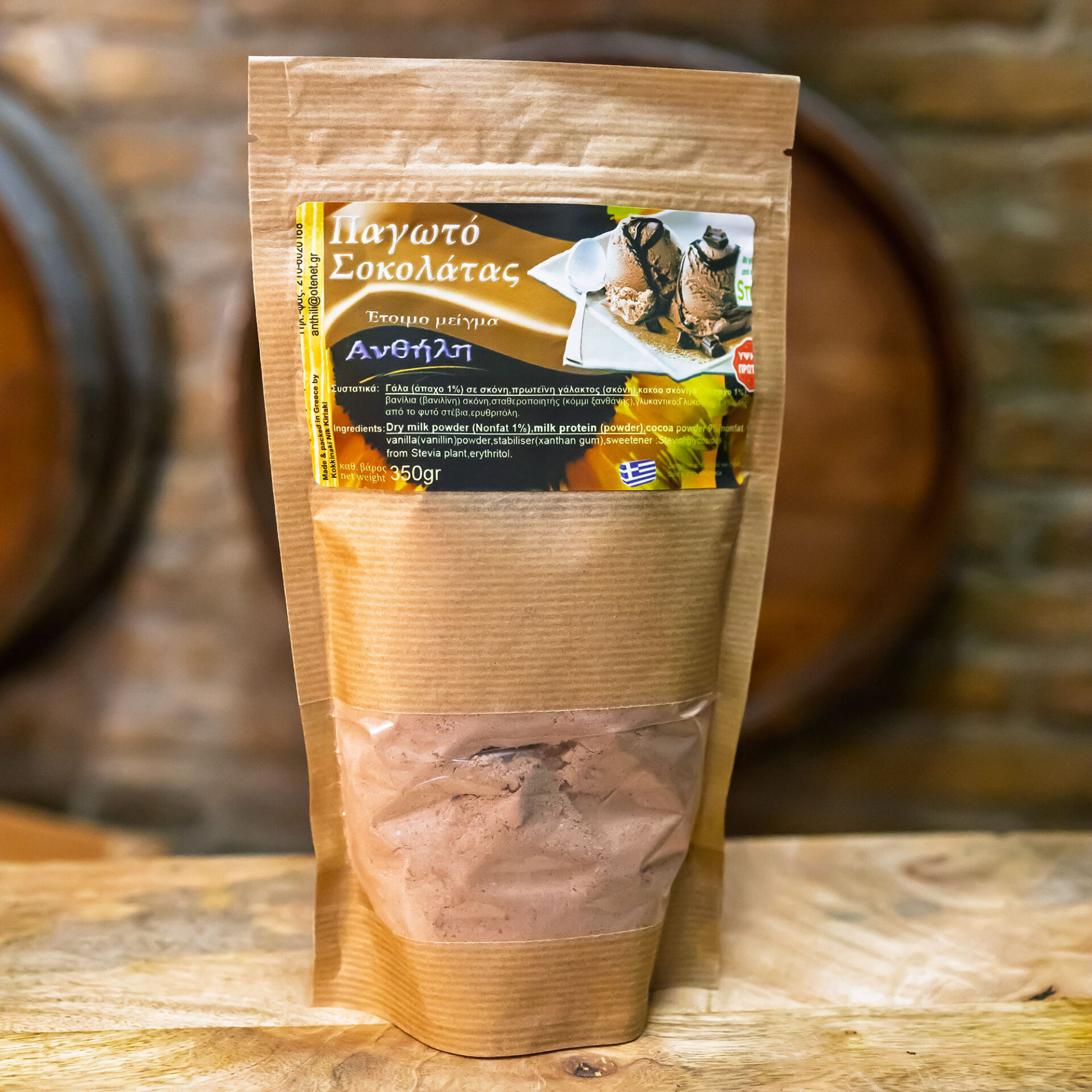 Ετοιμο μείγμα για παρασκευή παγωτο σοκολάτα χωρίς ζάχαρη , με απαχο γάλα και πρωτεΐνη γάλακτος .
