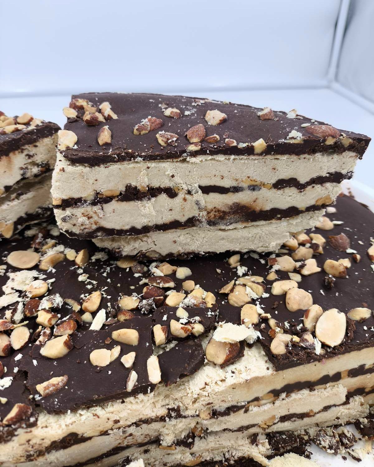 Χαλβάς με στρώσεις σοκολάτα υγείας και αμύγδαλο.