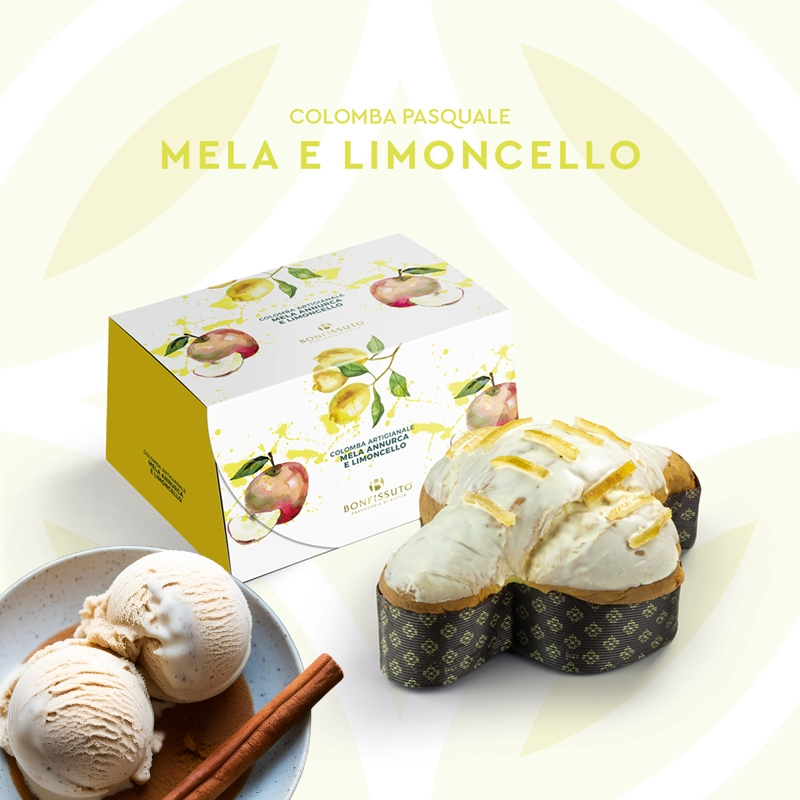 Παραδοσιακή χειροποίητη ιταλική colomba αργής ωρίμανσης , γεμιστή με εκπληκτική κρέμα Limoncello , ολόκληρα κομμάτια μήλου Annurca IGP και παγωτο μπισκότο κανέλα , με επικάλυψη λευκής σοκολάτας και λεπτές φέτες λεμονιού απο την Σικελία, μία colomba limited edition, απο την μοναδική σισιλιάνικη pasticceria Bonfissut