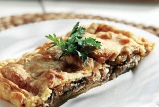 Μακεδονίτικη αυθεντική πίτα , με χειροποίητο φύλλο και γέμιση μελιντζάνας , κιμά , κρεμμύδι , μαιντανό , δυόσμο και παρθένο ελαιόλαδο.
