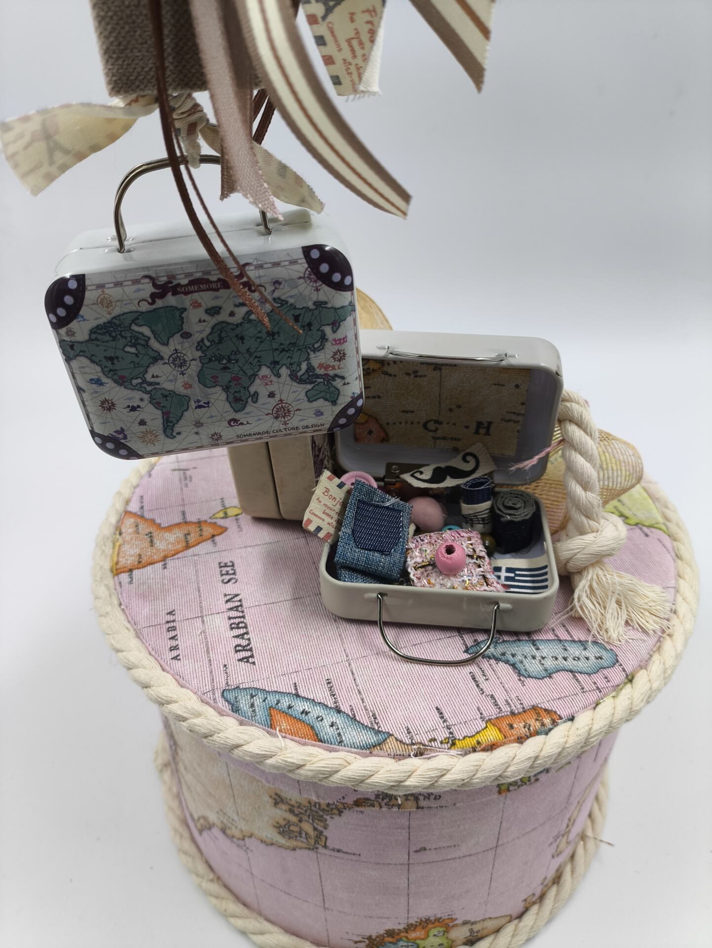 Χειροποιητο υφασμάτινο κουτί με αντίστοιχη λαμπάδα με θέμα ταξίδια