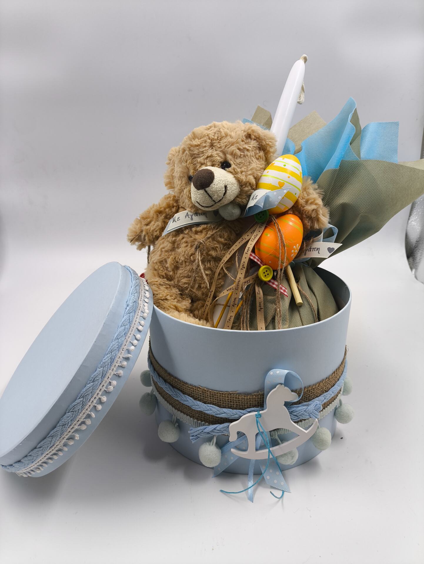 Πασχαλινή σύνθεση με χειροποίητο υφασμάτινο κουτί που περιέχει λαμπάδα με λούτρινο αρκουδάκι και σοκολατένιο αυγό γάλακτος