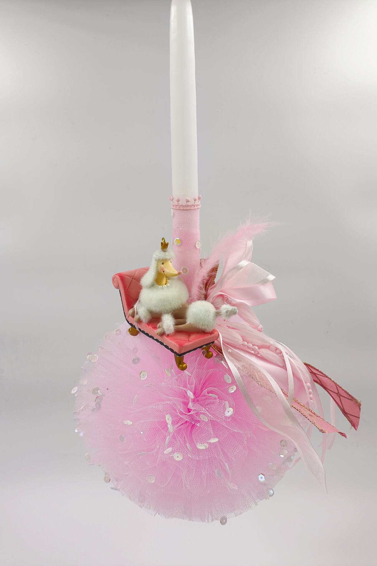 Χειροποίητη λαμπάδα με διακοσμητικό σκυλάκι κανίς , πάνω σε ροζ bon bon