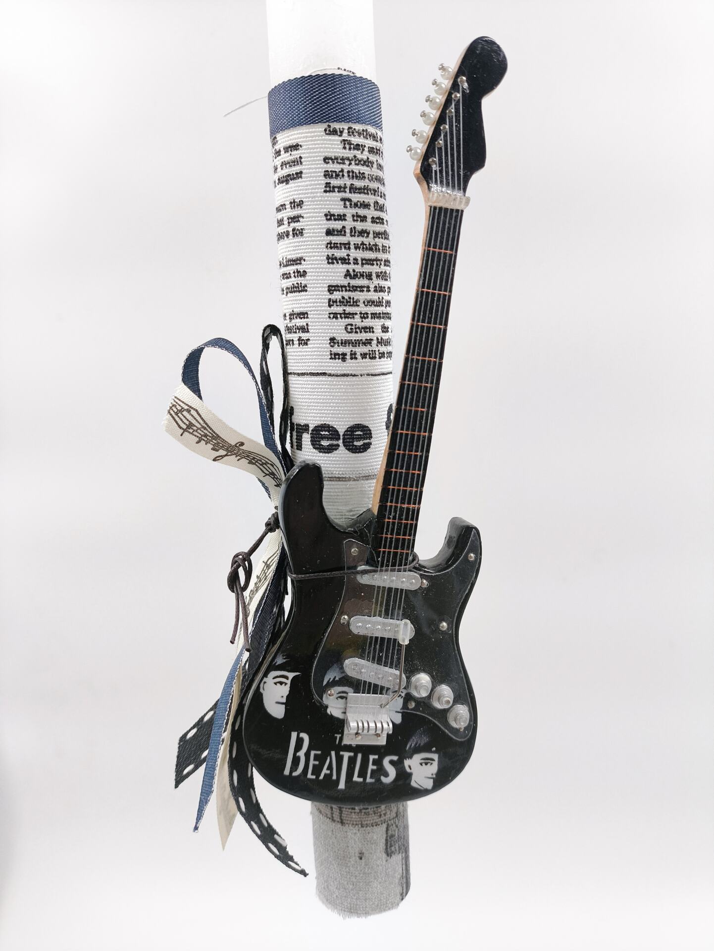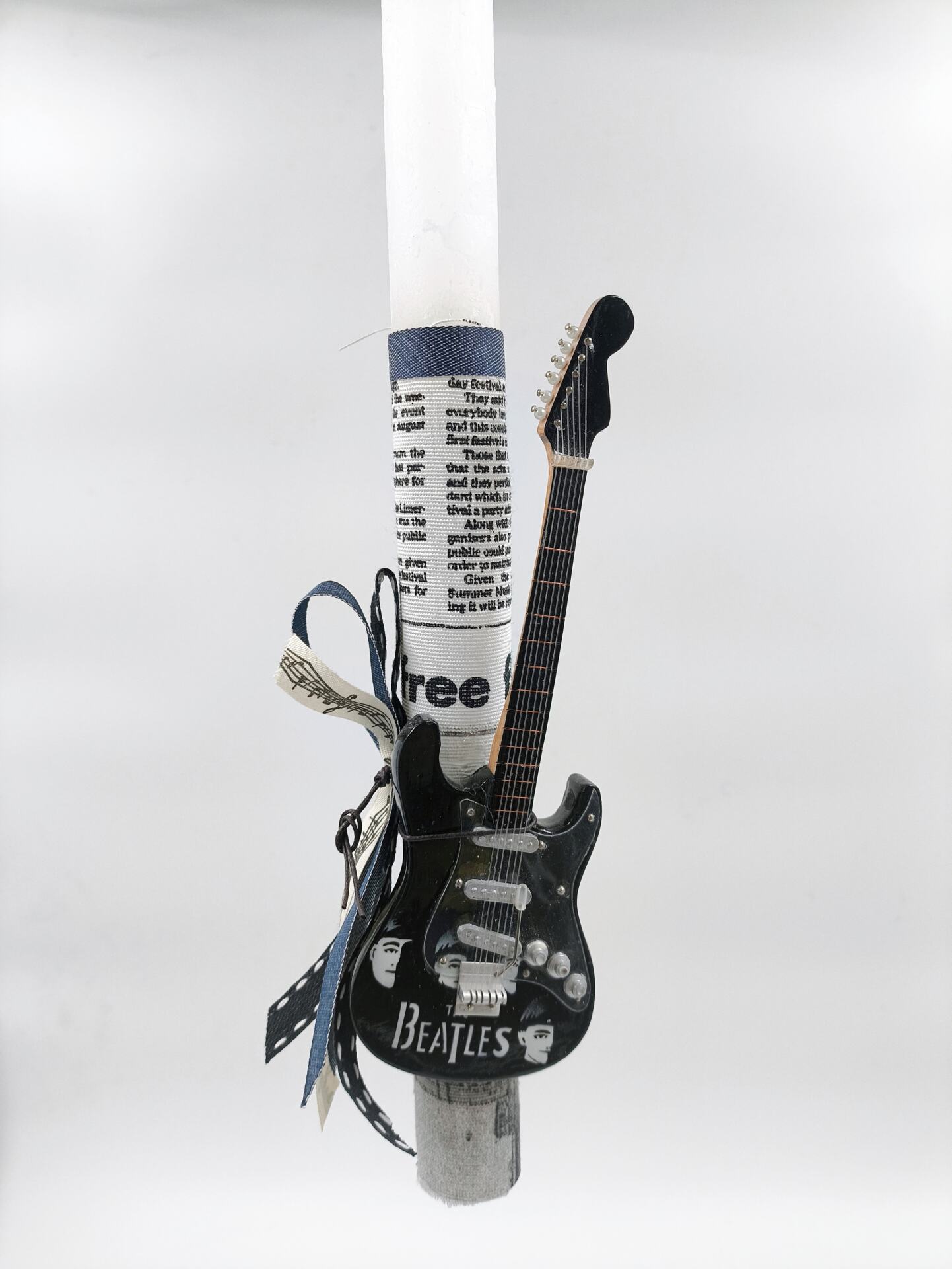 Χειροποίητη λαμπάδα διακοσμημένη με την ξύλινη ηλεκτρική κιθάρα του συγκροτήματος Beatles