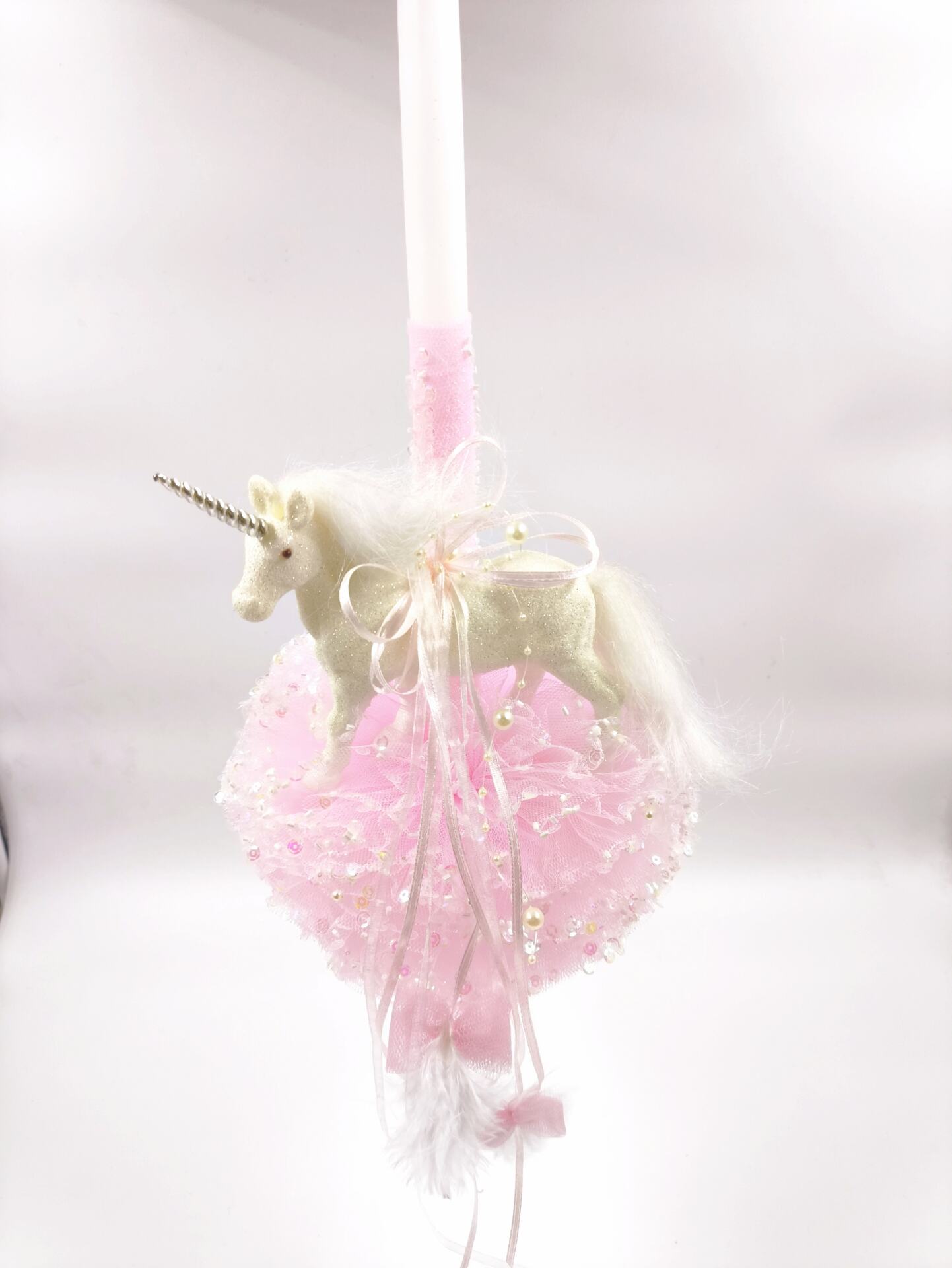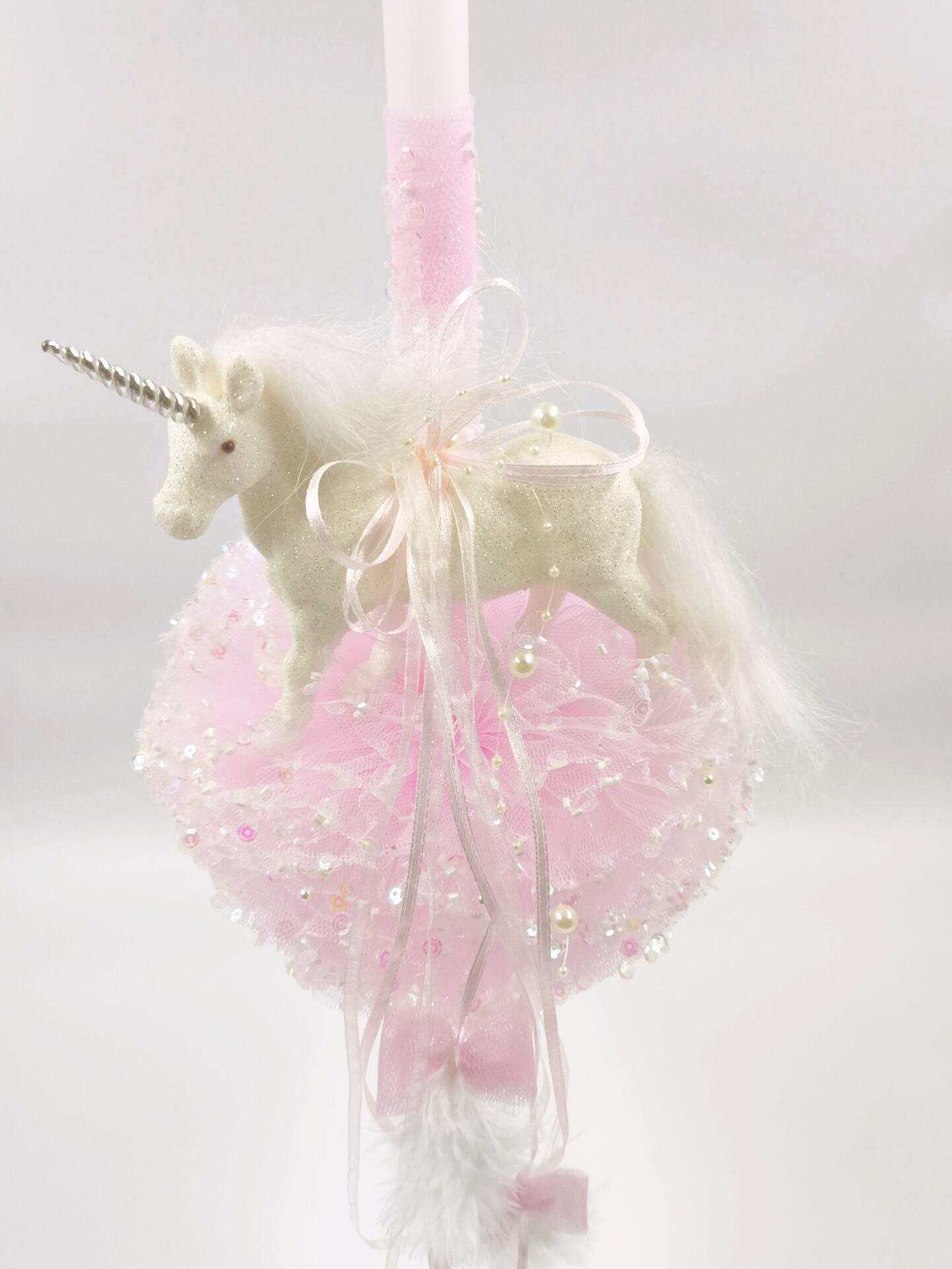 Χειροποίητη λαμπάδα Unicorn με μία παραμυθένια διακοσμητική φιγουρα ενός λευκού γυαλιστερού unicorn