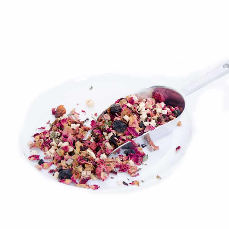 Μήλο, περιβλήματα κυνόροδου, φραγκοστάφυλλο, υβίσκος, μύρτιλλος, φραμπουάζ, ροδοπέταλα, μέντα.