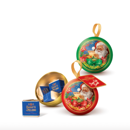 Κόκκινη χριστουγεννιάτικη μεταλλική μπάλα , η οποία περιέχει 4 μοναδικά ιταλικά σοκολατάκια cremino απο την Baratti Milano