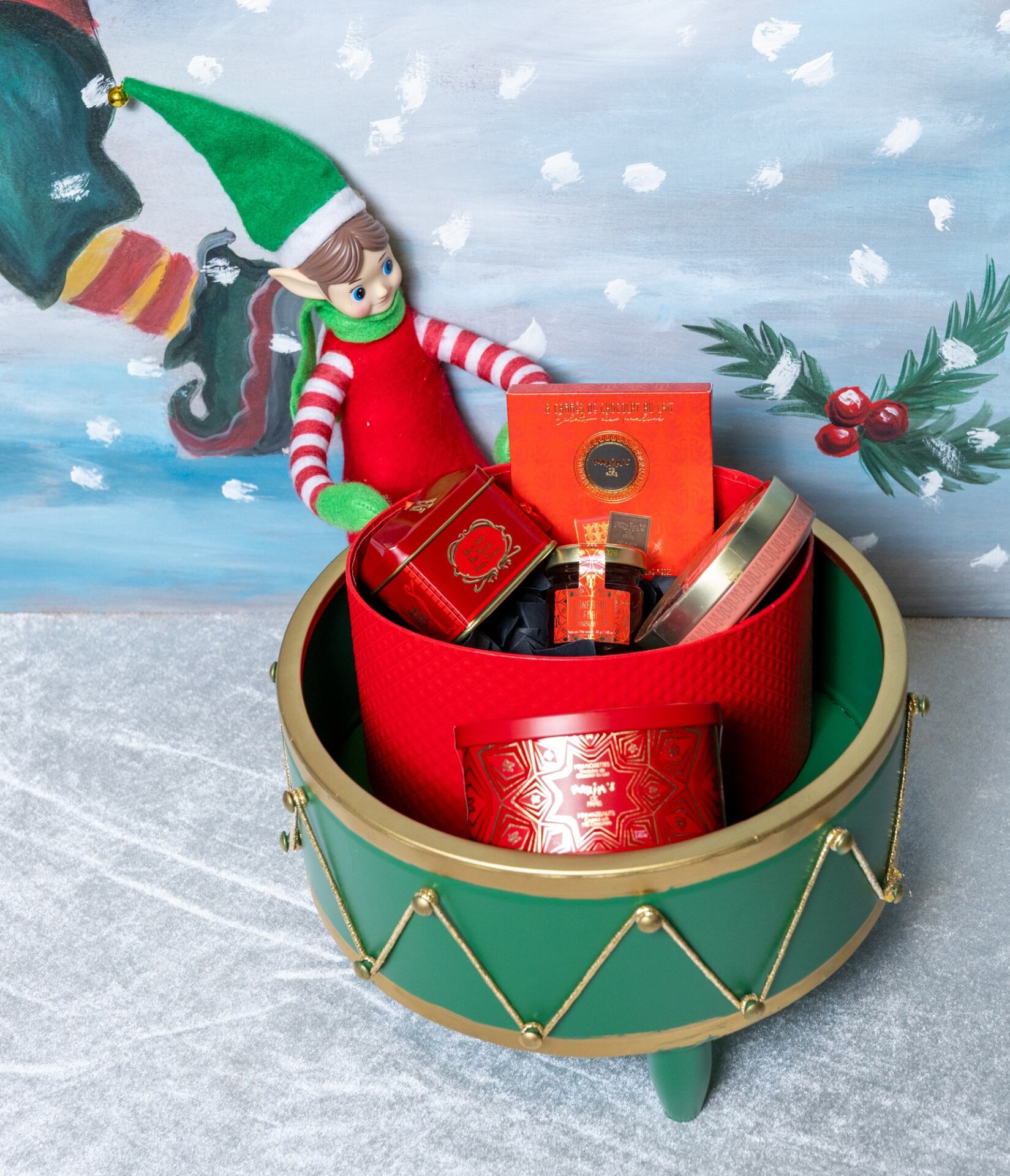 Χριστουγεννιατικη συνθεση ξωτικο-πρασινο τυμπανο η οποια περιλαμβανει