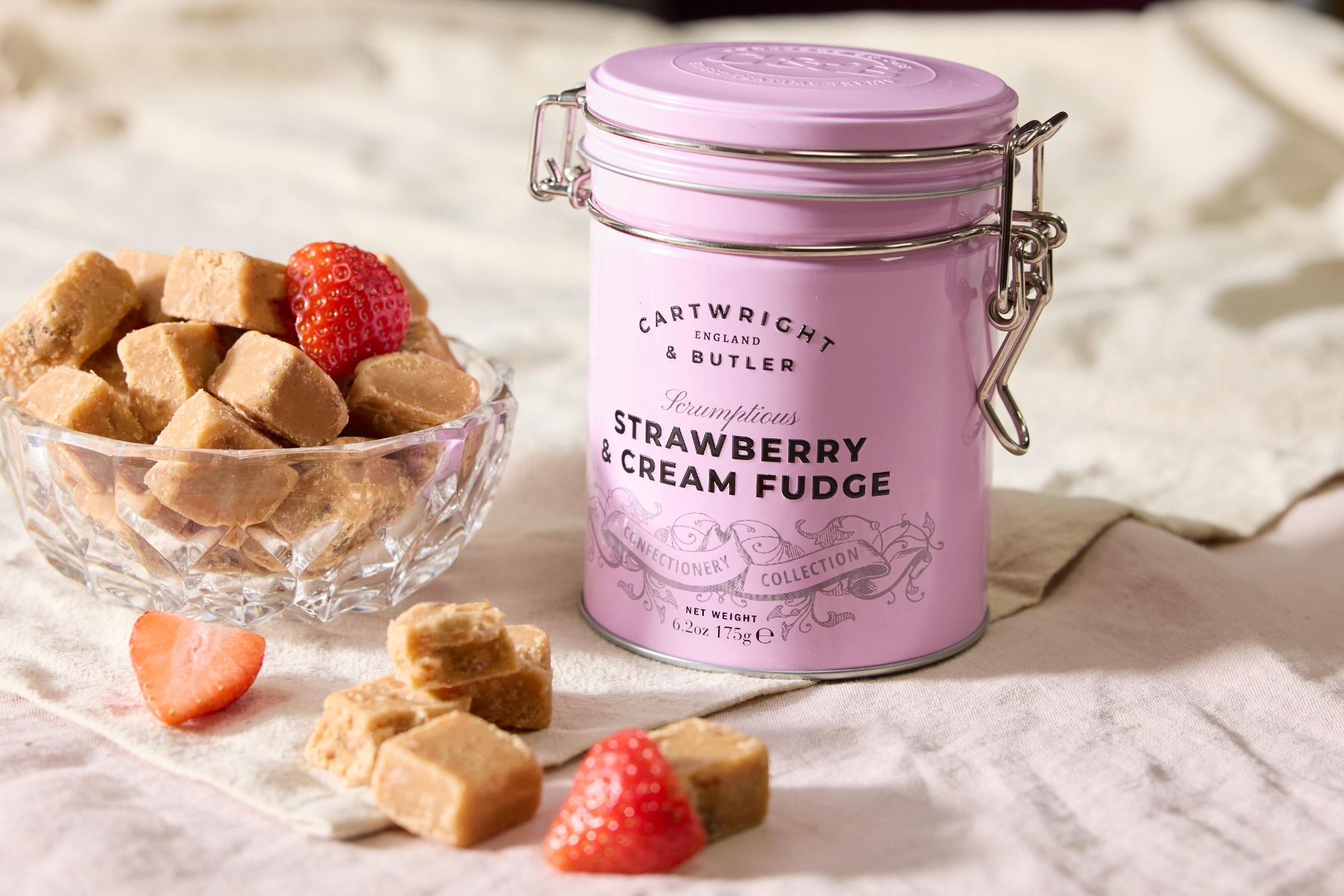 Ένα ολοκαίνουργιο προϊόν για την Cartwright & Butler, πήραμε μια παραδοσιακή συνταγή για fudge και προσθέσαμε απολαυστικά γλυκές αποξηραμένες φράουλες και μια σταγόνα κρέμας, για να παράγουμε ένα λαχταριστό fudge με φράουλα και κρέμα.